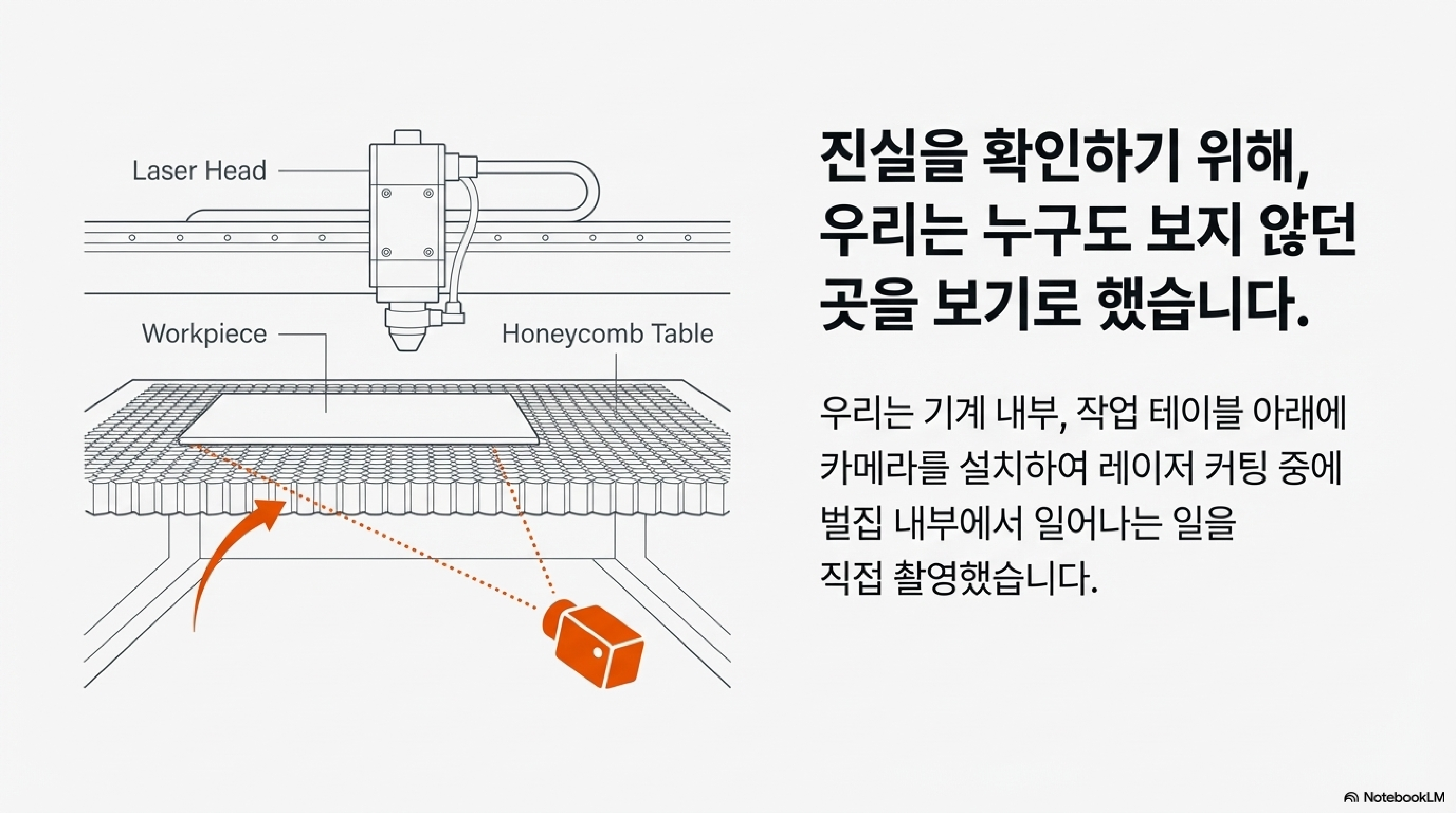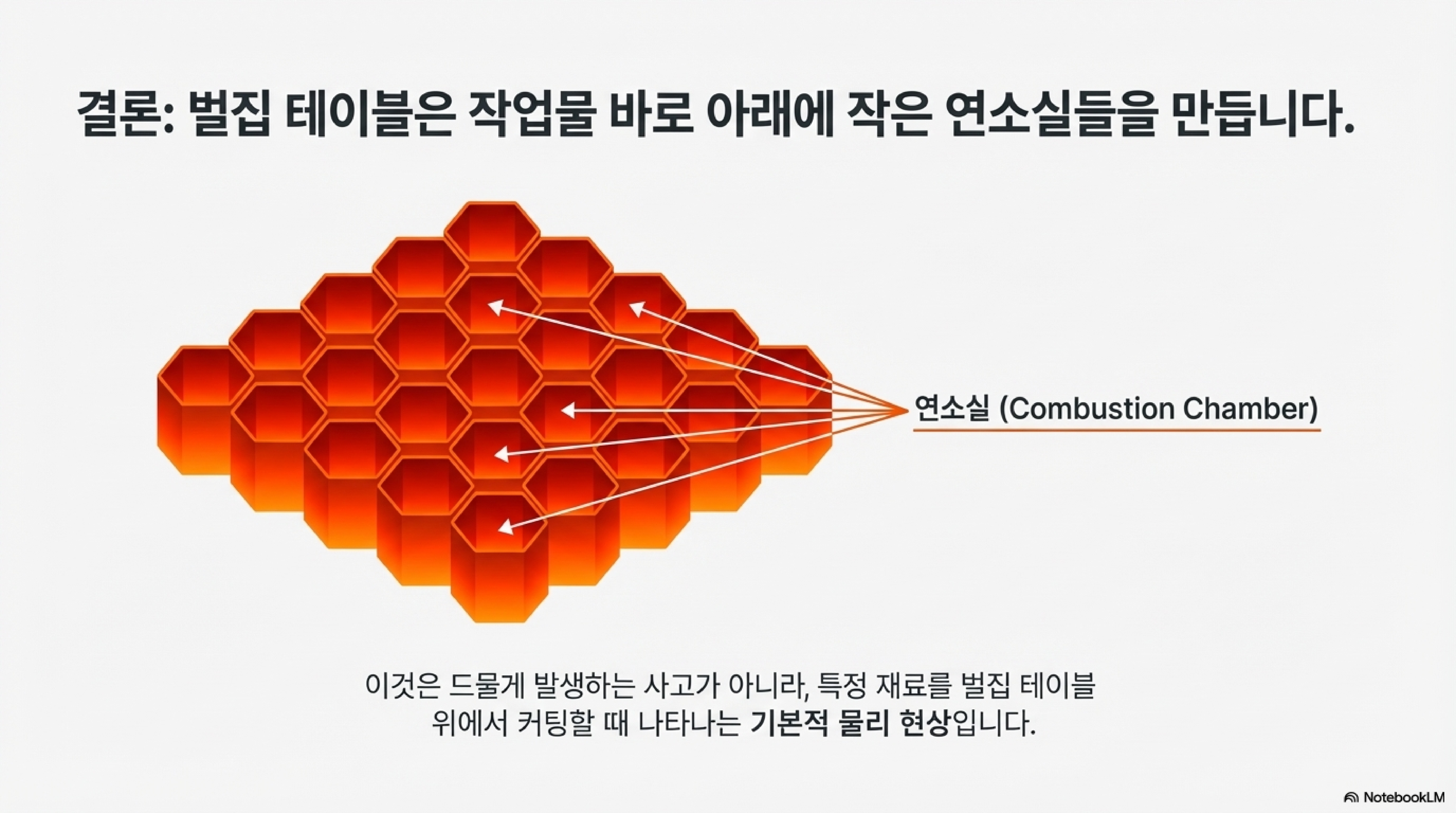 위험이 발생하는 과정은 간단하지만 치명적입니다. 아크릴과 같은 재료를 레이저로 절단하면 다량의 증기가 발생합니다. 이 증기는 작업 공간 아래에 위치한 허니콤 베드의 벌집 모양 셀 안으로 들어가 갇히게 됩니다. 문제는 그 다음입니다. 절단 과정에서 발생한 레이저의 잔여 에너지가, 차가운 허니콤 셀 내벽에 다시 달라붙어 재응축된 가연성 증기를 점화시키는 것입니다.