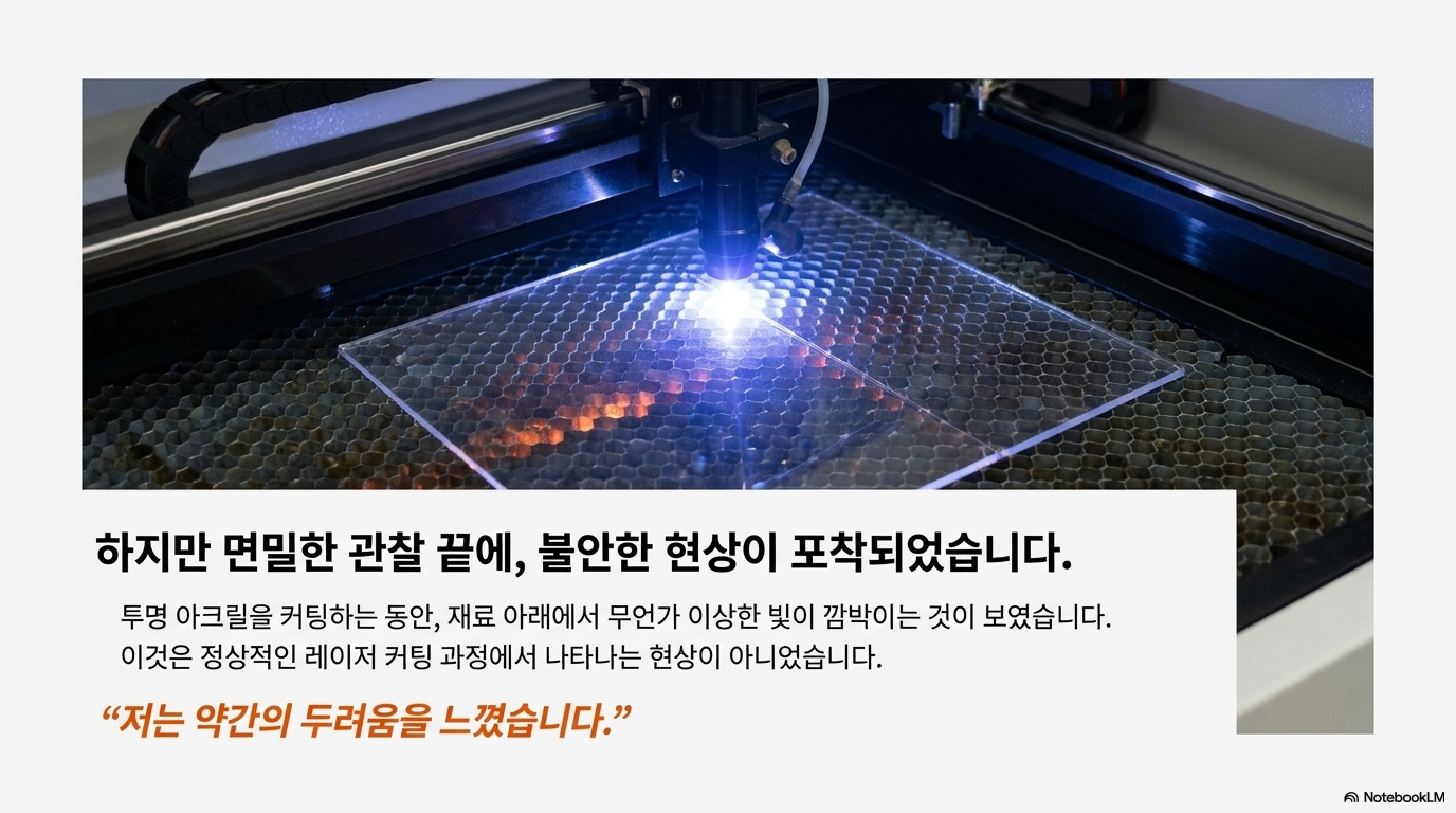 이 위험이 특히 교활하고 알아차리기 어려운 이유는 바로 재료의 특성 때문입니다. 투명한 아크릴을 절단할 때는 재료를 통해 허니콤 베드 아래에서 발생하는 '주황색 불꽃 폭발'을 직접 목격할 수 있습니다. 이는 위험을 즉각적으로 인지할 수 있는 명백한 신호입니다.