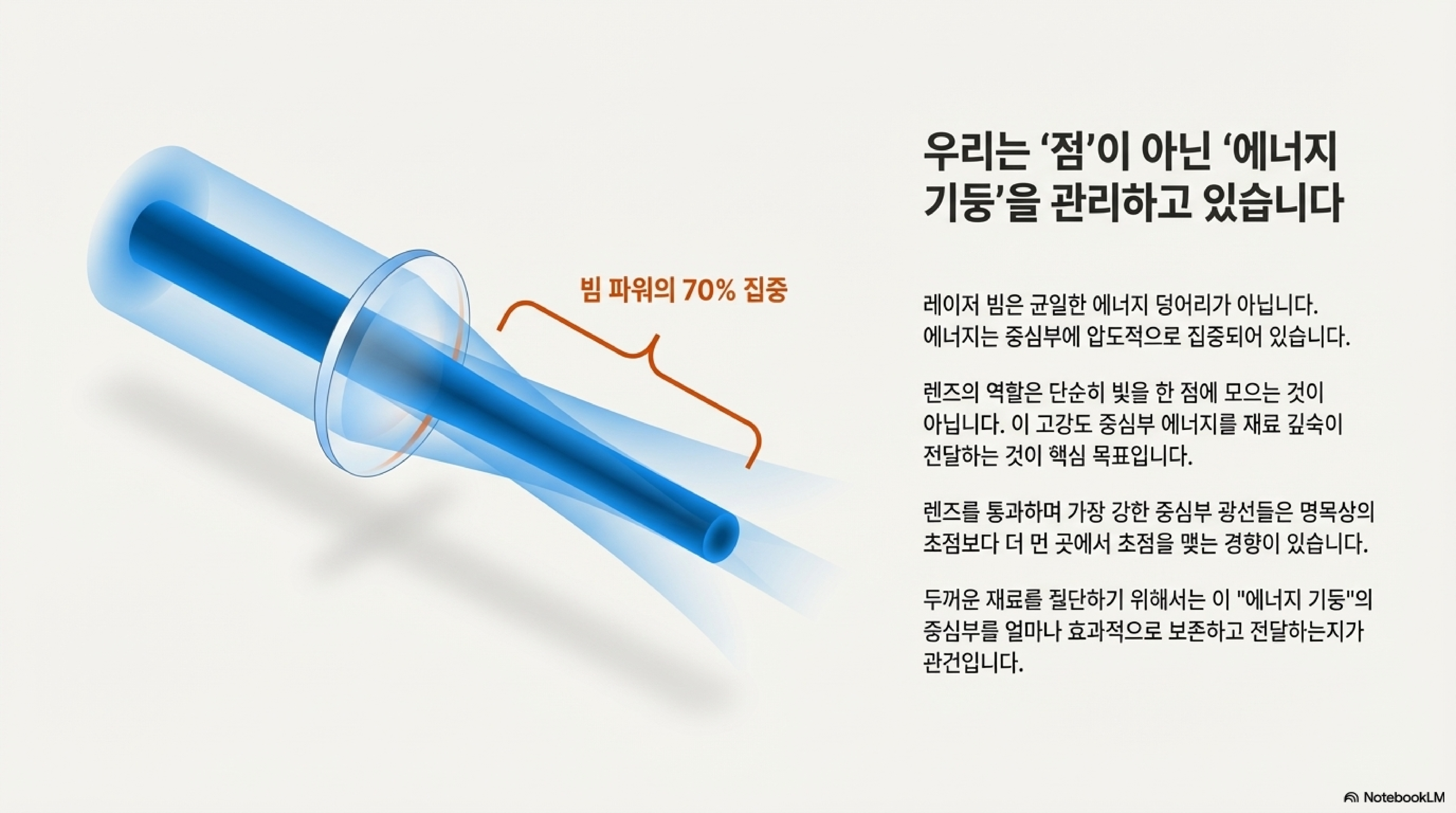 우리는 흔히 레이저의 '초점'을 모든 빛이 모이는 하나의 완벽한 점(point)이라고 생각합니다. 하지만 실제 초점은 마치 허리가 잘록한 모래시계처럼 복잡한 형태의 영역(zone)입니다.