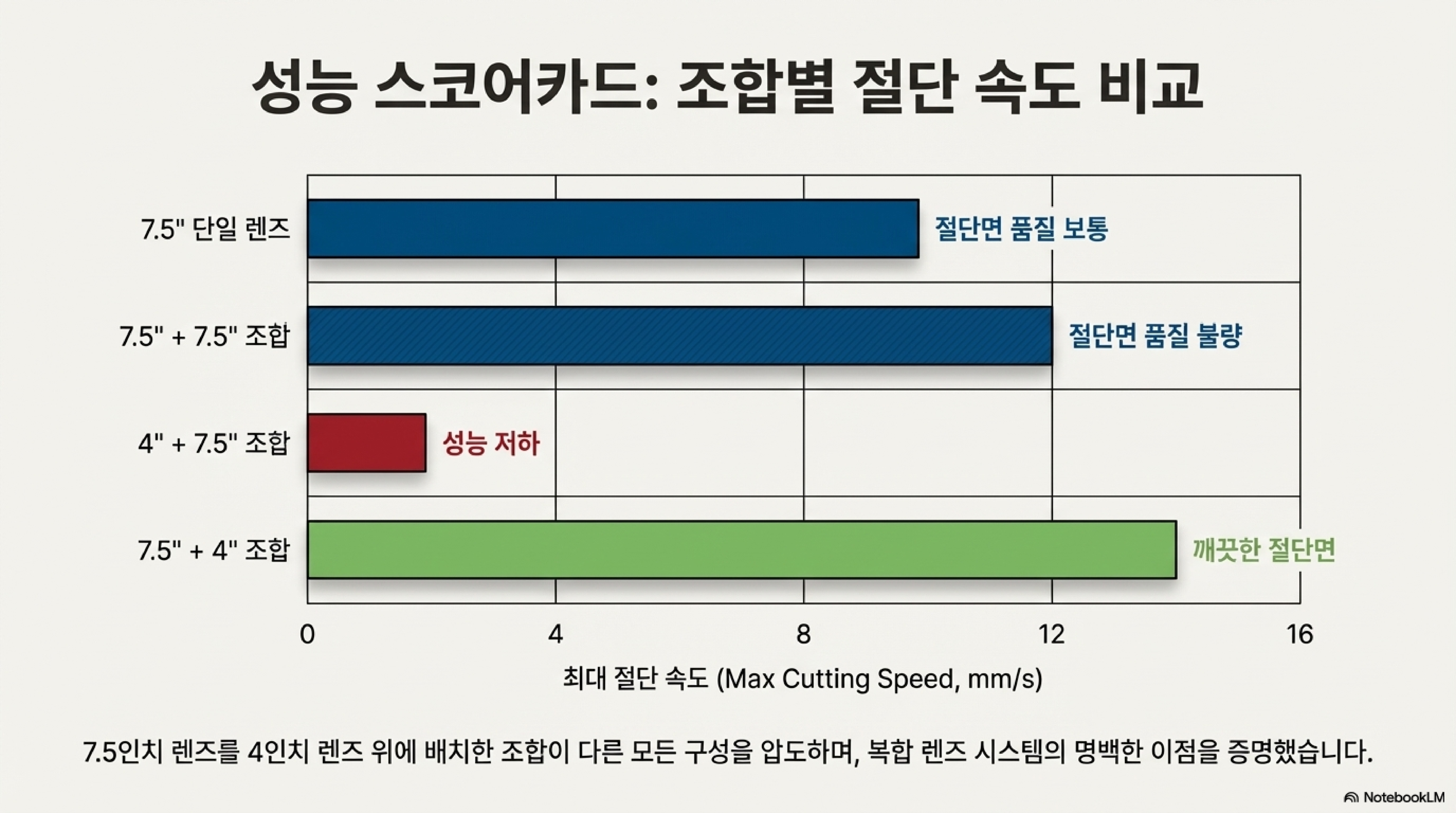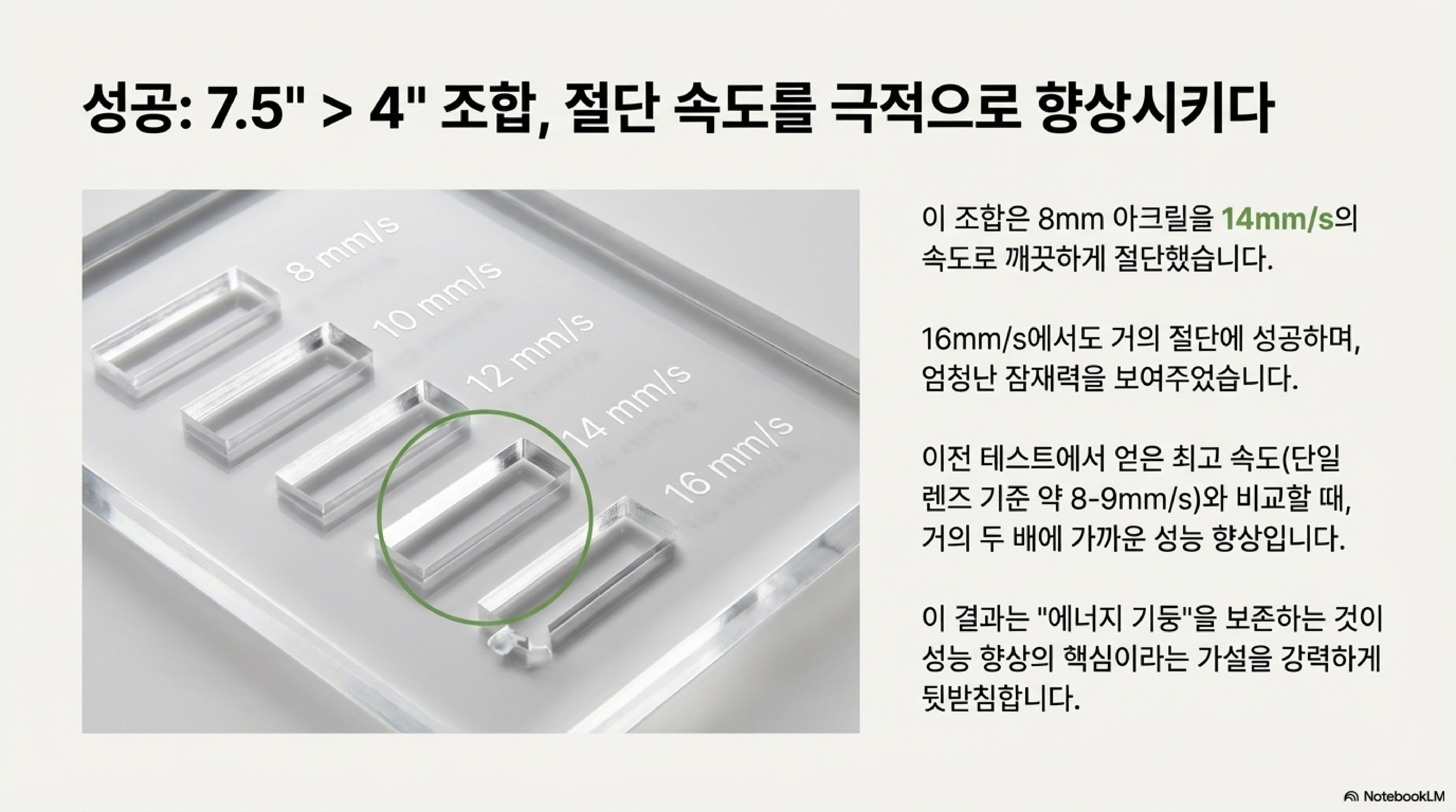 하지만 렌즈의 순서를 바꾸자 마법 같은 일이 일어났습니다. 반대로 긴 초점 렌즈(7.5인치)를 짧은 초점 렌즈(4인치) 위에 배치했을 때, 절단 속도가 비약적으로 향상되었습니다. 단일 렌즈로는 평균 6~8mm/s에 불과했던 절단 속도가 이 조합을 통해 14mm/s까지 치솟으며 거의 두 배 가까이 빨라진 것입니다.