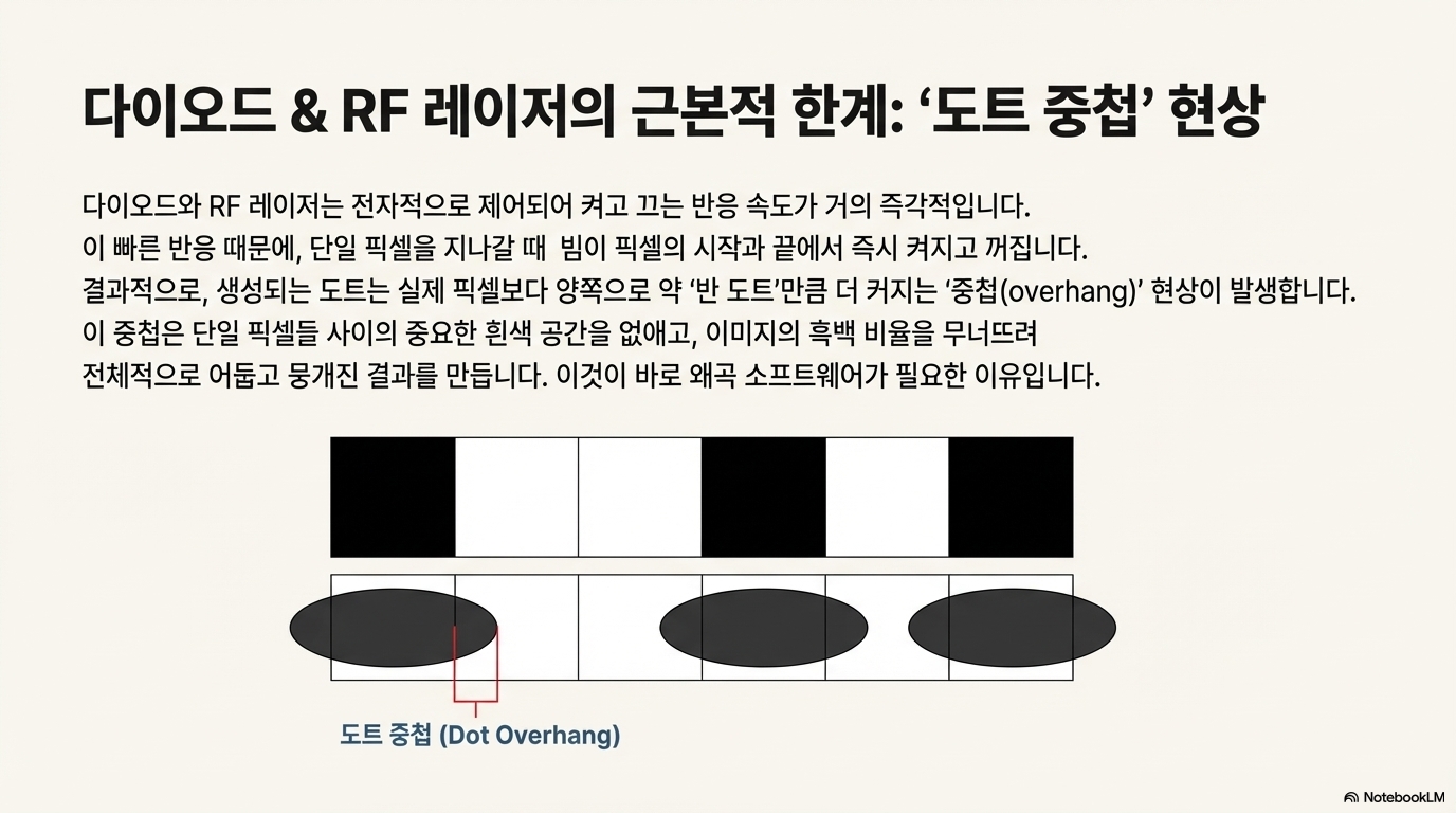 즉각적인 반응 속도를 가진 레이저의 핵심 문제는 '점 오버랩(dot overlap)'입니다. 레이저가 픽셀 하나를 지나갈 때마다, "모든 픽셀에 점의 절반이 걸치는(half a dot overhang on every pixel)" 현상이 발생합니다. 이 작은 오버랩이 두 검은 픽셀 사이의 소중한 흰색 픽셀을 완전히 덮어버리며 이미지의 섬세한 부분에서 검은색과 흰색의 중요한 비율을 무너뜨리고, 결국 이미지를 원본보다 어둡고 부정확하게 만듭니다.